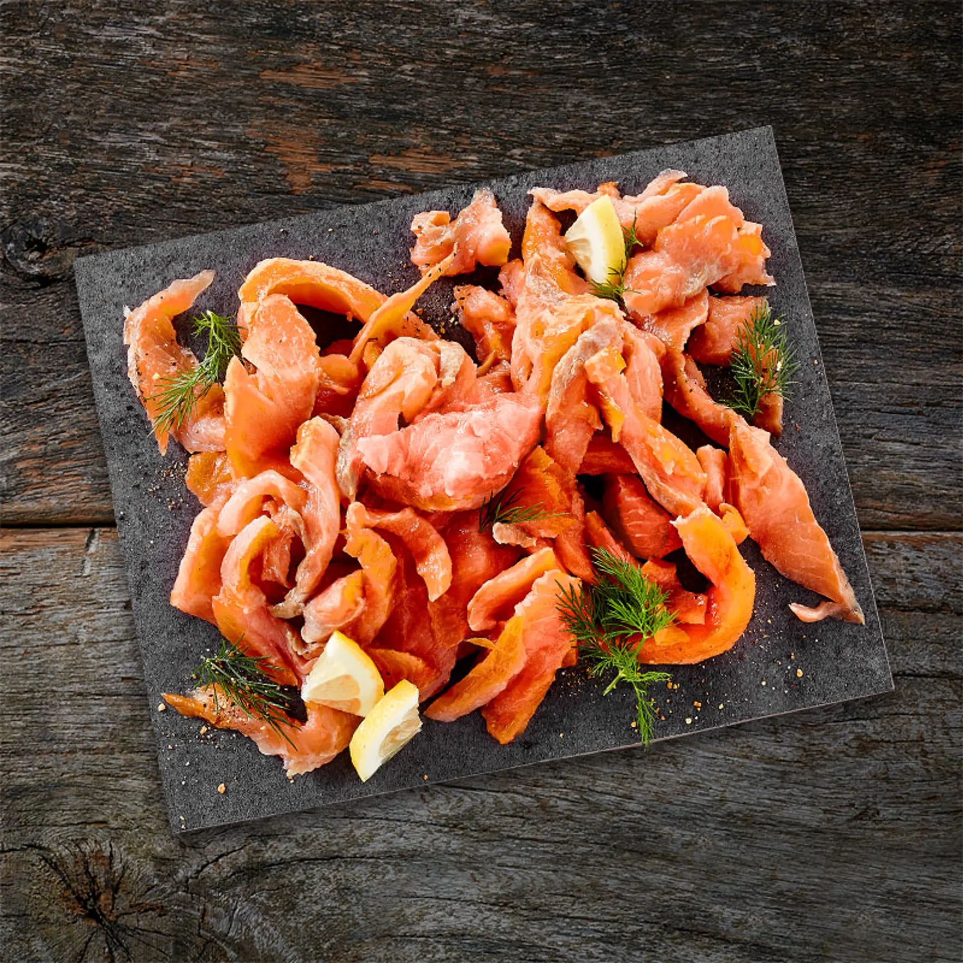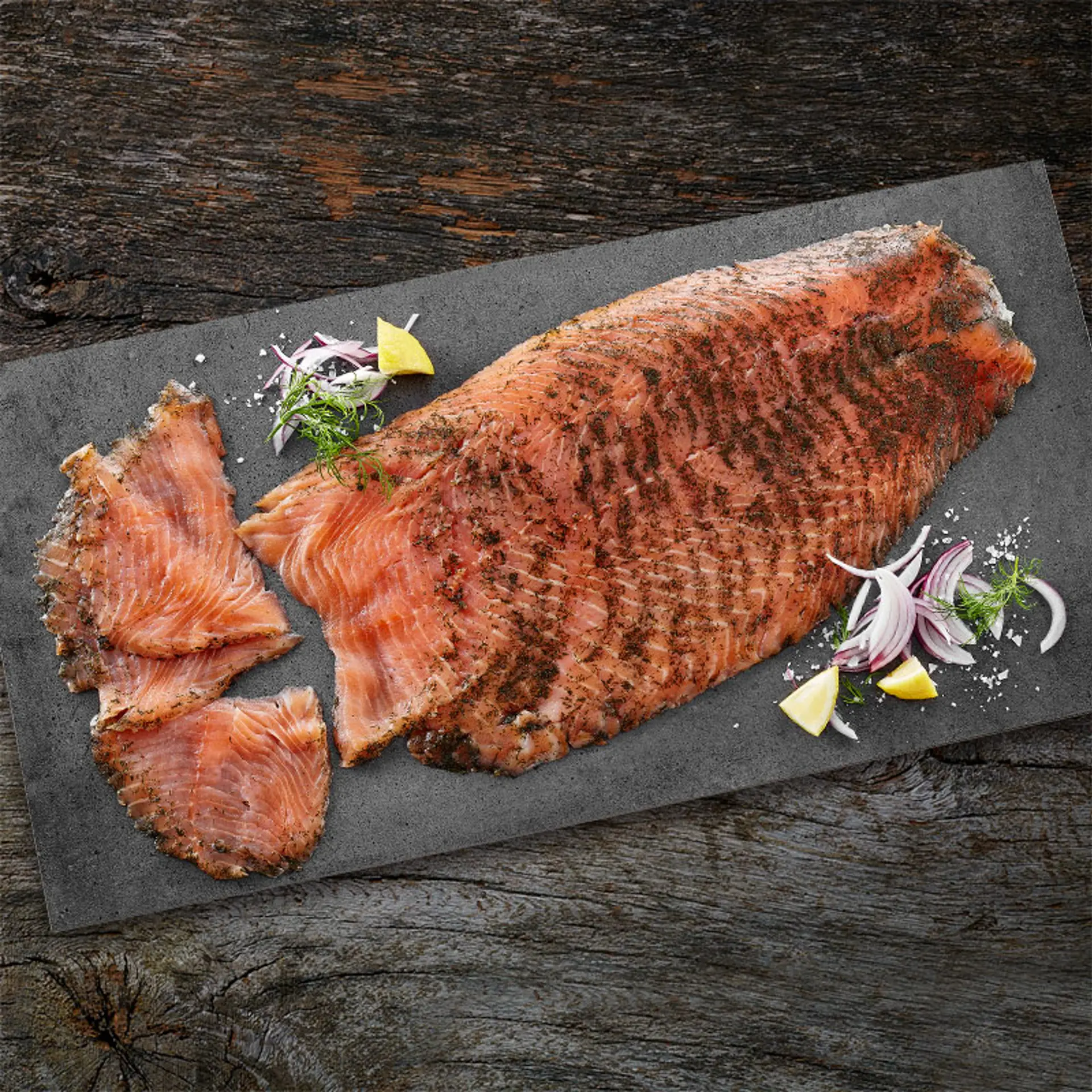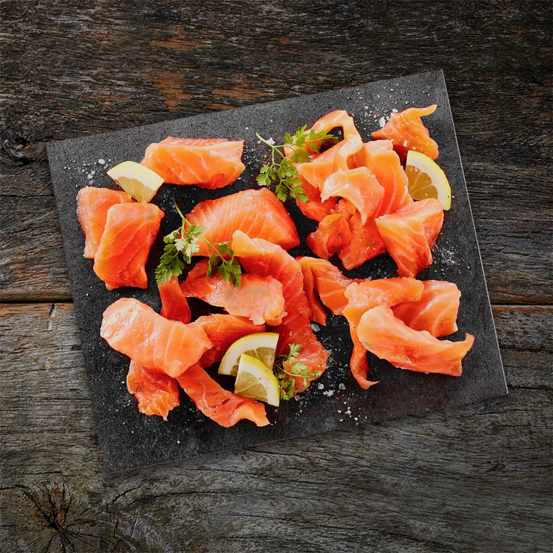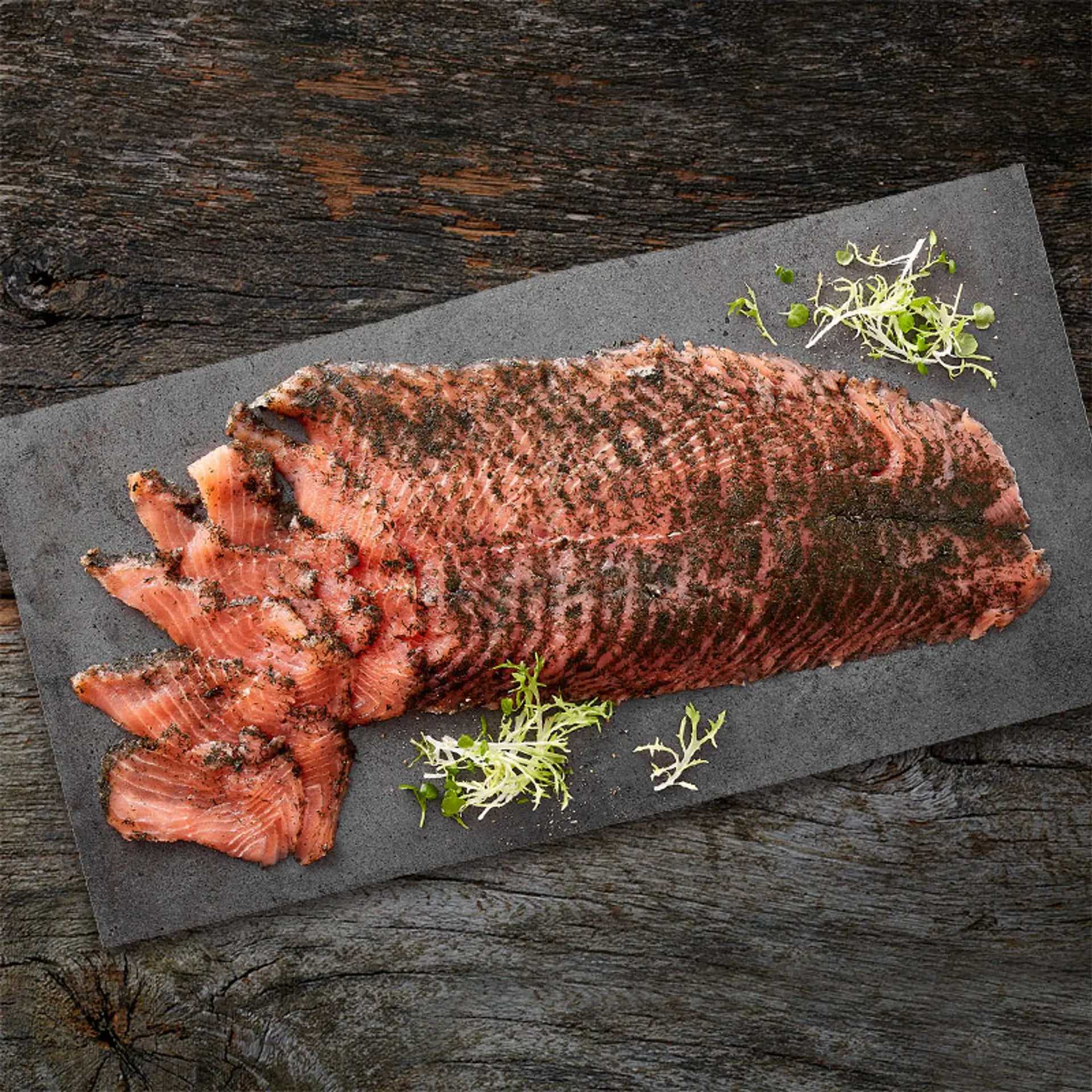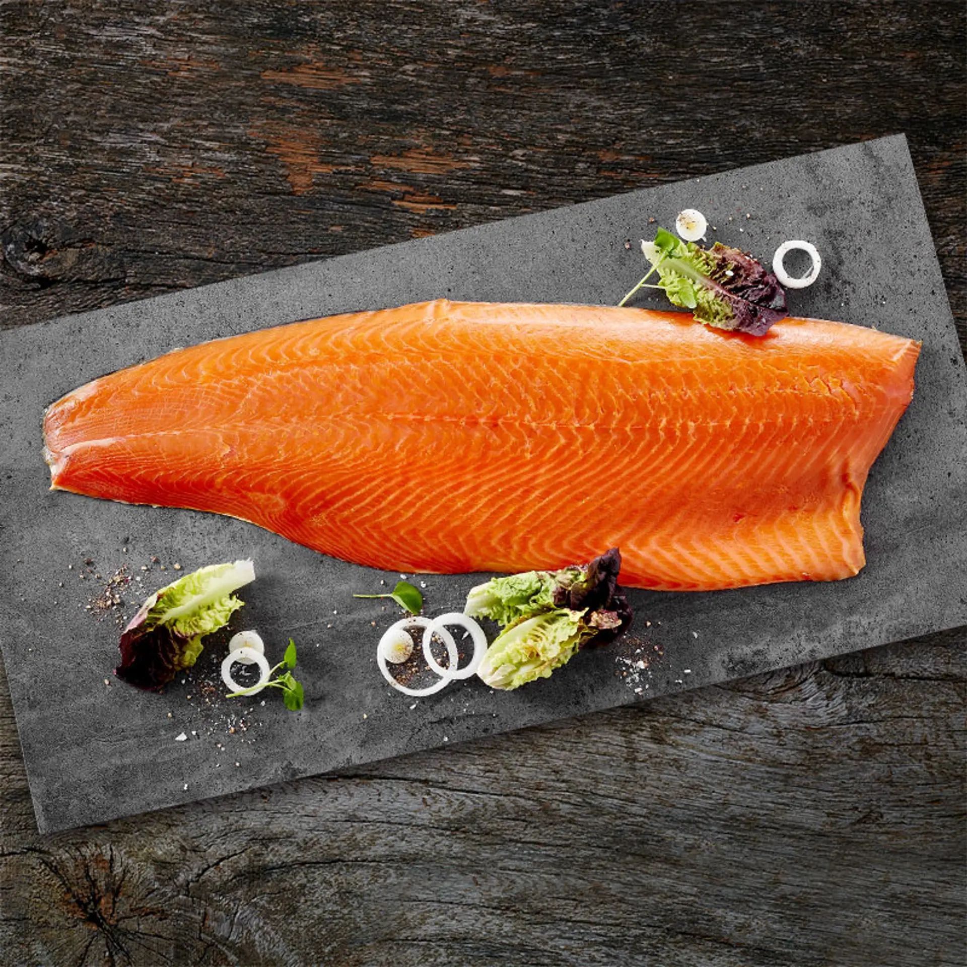 Rökt norsk lax, helsida, torrsaltad, Trim D, hängd